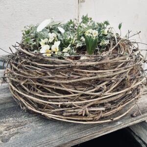 Aus Nielen und Birkenzweigen fertigen wir dieses Jahr ein etwas „ruhigeres“ Nest an, welches wir frühlingshaft bepflanzen und mit kleinen Eili und Federn schmücken. Das Nest darf gerne draussen vor der Tür oder im Freien seinen Charme ausspielen.